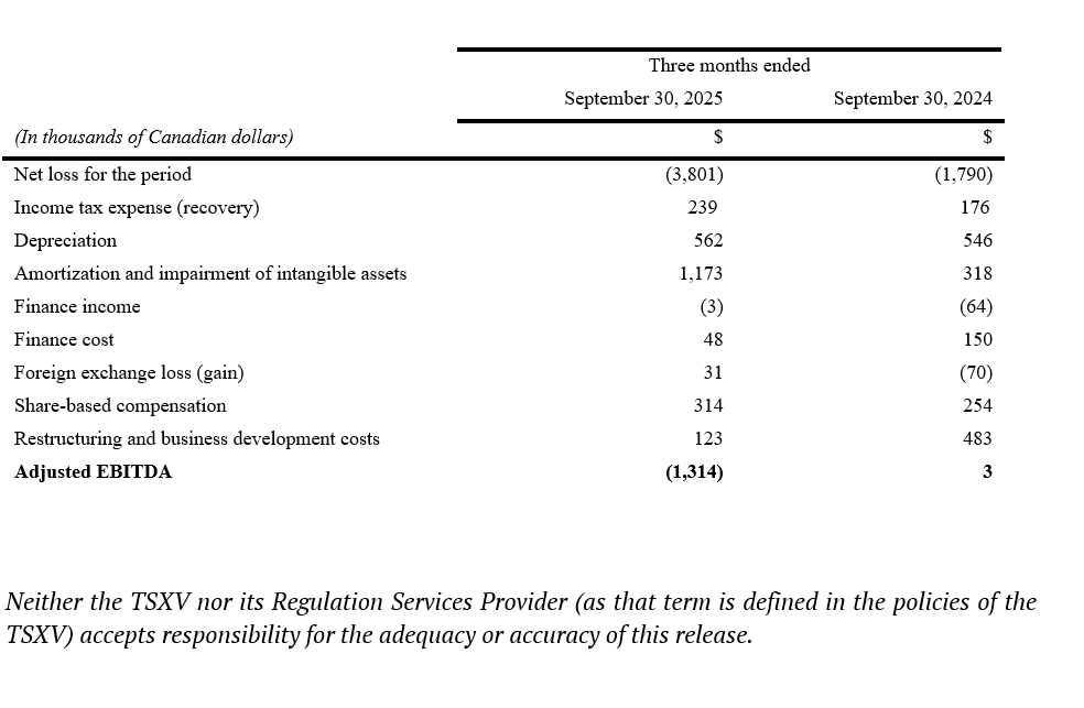 Adjusted EBITDA is defined by the Company as net income or loss before income taxes, finance costs, finance income, depreciation and amortization, decrease in net present value of franchise obligations, foreign exchange gains/losses, assistance payments from Franchise League and government assistance, restructuring and business development costs, impairment charges, and share-based compensation. We believe that Adjusted EBITDA is a useful measure of financial performance because it provides an indication of the Company’s ability to capitalize on growth opportunities in a cost-effective manner, finance its ongoing operations and service its financial obligations. A reconciliation of Adjusted EBITDA to net loss may be found in the Company’s Management's Discussion and Analysis for the three-month period ended September 30, 2025.
