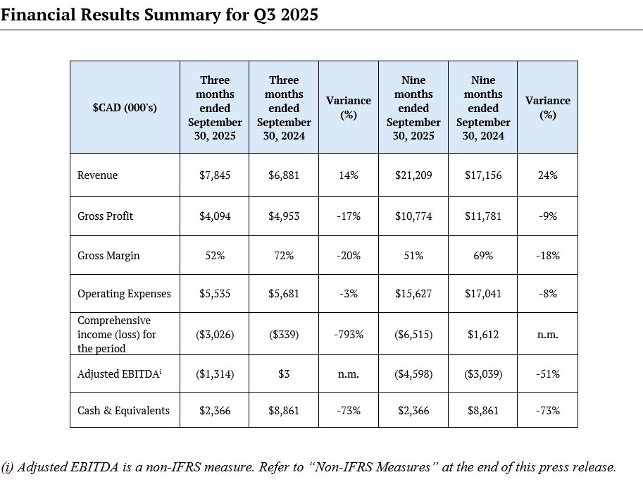 - Comprehensive loss of $3 million in Q3 2025, compared to comprehensive loss of $0.3 million in the prior year. The change was mainly due to the VCT agreement write-off, reduced gross margin from event-heavy revenue mix, and lower foreign currency translation gains relative to 2024, partially offset by lower operating expenses.
